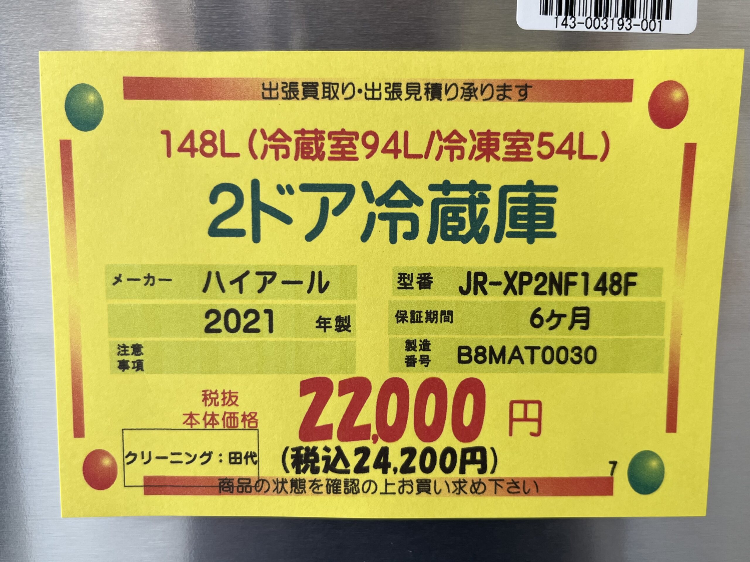 中古 ハイアール 148L 2ドア冷蔵庫 2021年製 JR-XP2NF148F