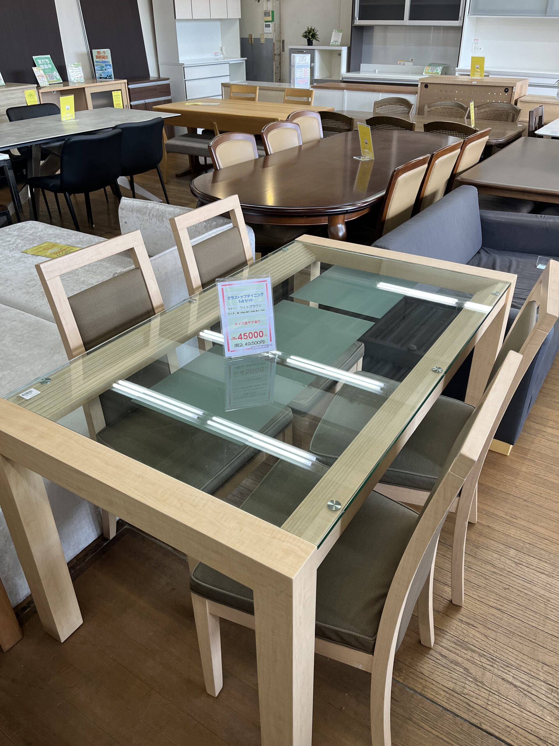 中古 ガラストップダイニング5点セット ライトブラウン